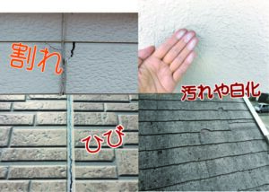 割れ、コーキングのひび、チョーキング(塗膜の表面が白く粉になる現象)、苔や風化で汚れた屋根や、壁